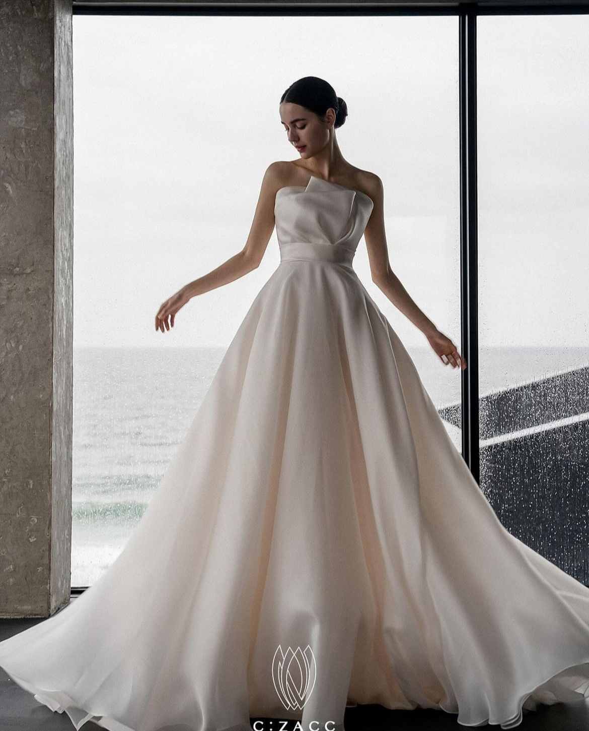 웨딩드레스 고를때 알아두면너무나도 쓸모 있는"실크 웨딩드레스" 종류에요 1. 미카도실크드레스 묵직하고 고급스러운 광택감때문에실크 중에서는 가장 먼저 떠오르고 선호하는 소재에요